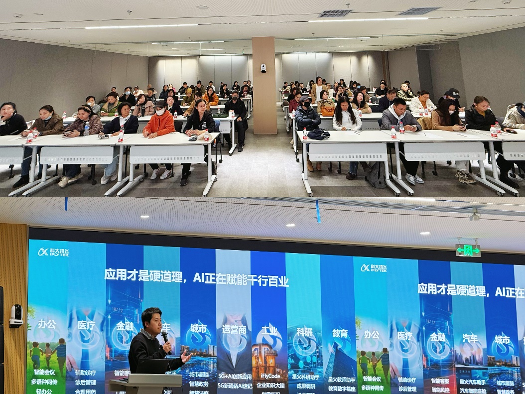 在分享交流环节,科大讯飞产品经理张梦一、传媒产品线总监邵青详细介绍了科大讯飞的发展历程、核心技术以及在人工智能领域的卓越成就,从智能语音识别到自然语言处理,从智慧教育解决方案到智能办公系统,全方位展示了科大讯飞作为人工智能国家队在创新驱动,引领行业变革方面的贡献。老师们聚精会神地聆听,不时围绕自身教学、科研、管理等相关内容提问,现场学习氛围浓厚。通过分享交流,大家不仅对科大讯飞的人工智能技术有了初步认知,也对其在教育教学中可能引发的变革充满期待。