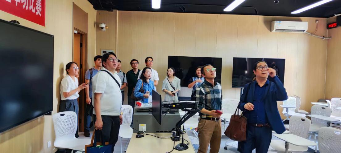 代表团一行首先来到学校立德楼5层,参观学校于2021年投入使用的基础智慧教室和多场景智慧教室,体验了智慧教室从不同场景出发设计的双屏联动、远程互动、多屏研讨等功能。代表团一行对我校依托“中传云”强大的数据存储、算力和分析能力,以技术赋能课堂,创新探索智慧化教学应用的新模式表达了高度赞赏。