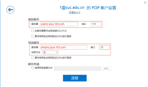 第二步:输入完整的邮箱账号,点击连接。(1@cuc.edu.cn)