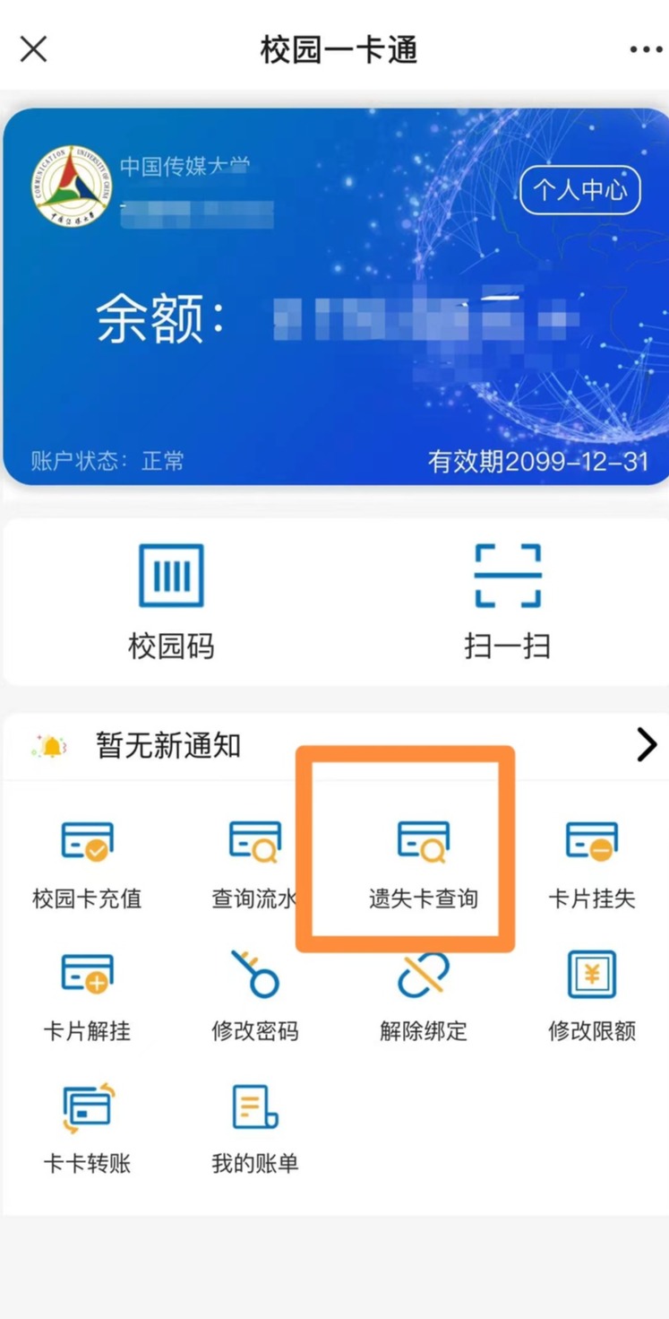 校园卡丢失时,想要查询自己卡是否已被他人捡到。可以通过中国传媒大学企业微信或中传app,点击“校园卡”,进入“遗失卡查询”界面,寻找失卡界面,点击“查询”,获取相关信息。