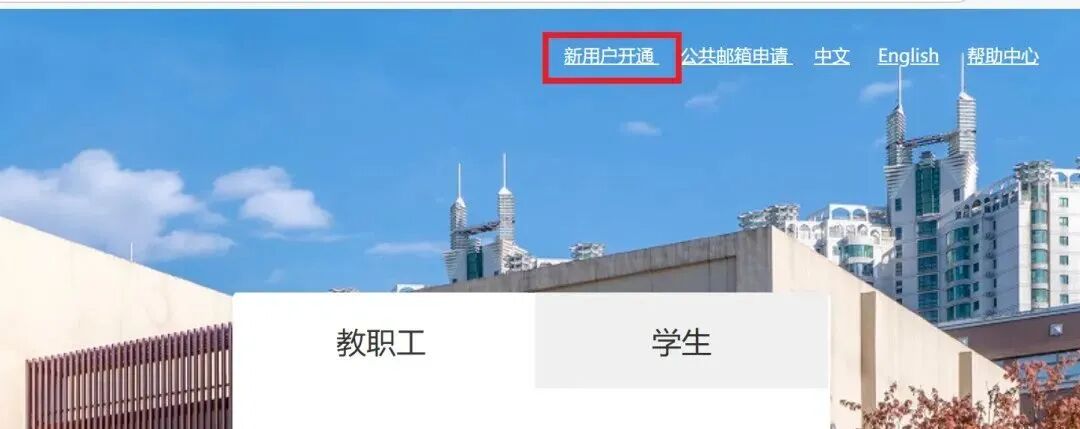 点击右上角“新用户开通”,进入“邮箱自助开户”页面(通过统一身份认证进入)