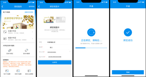打开“北京一卡通”,打开手机NFC设置,点击首页“高校服务”, 按提示操作即可在线申领电子学生卡。