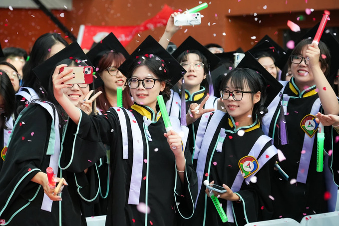 歓声と拍手の中、張樹庭氏は「篤行する自分自身を目指し、人生の新たな旅に向かおう」と題したスピーチを行い、学校と廖祥忠書記を代表して全卒業生に素敵な祝福を送り、尽力してくれた教職員や、学校の発展を支援してくれた保護者、卒業生、そして社会各界の方々に感謝の意を表し、学生たちに信念を持ち、勇気を持って前進し、遠い道のりでも必ず到達する決意と、日々少しずつ努力する粘り強さで、小さな一歩一歩を積み重ね、大きな成果を収めるよう励ましました。