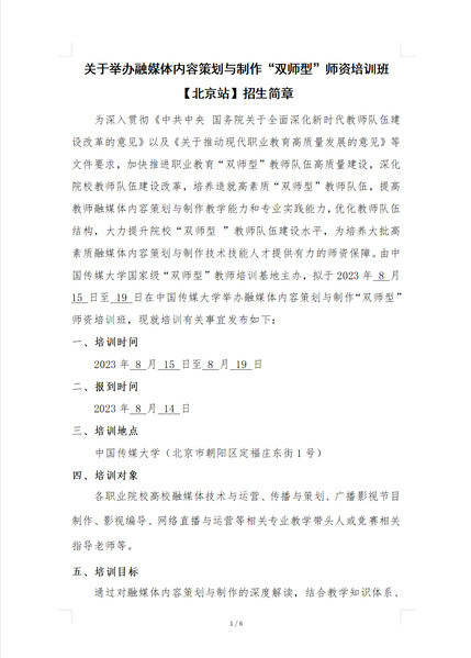 中国传媒大学国家级“双师型”教师培训基地拟于2023年举办融媒体内容策划与制作“双师型”师资培训班