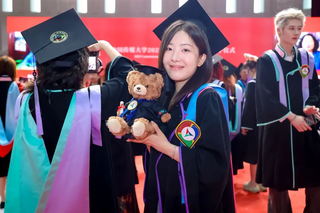 문화산업관리학원 2025년 예술관리전공 졸업생 예샤오샤오(葉嘯笑)가 어머니 친징(覃靜) 의사와 함께 무대에 올랐다. 친징은 딸의 대학 4년간의 성장변화를 공유하며 학교가 학생들에게 저력과 힘을 부여한 것에 감사하고, 학생들이 미래의 나날에서 계속 전공으로 마음을 다스리고 온도로 사람을 비추며, 초심을 잊지 않고 빛이 있는 사람이 되기를 축원했다.