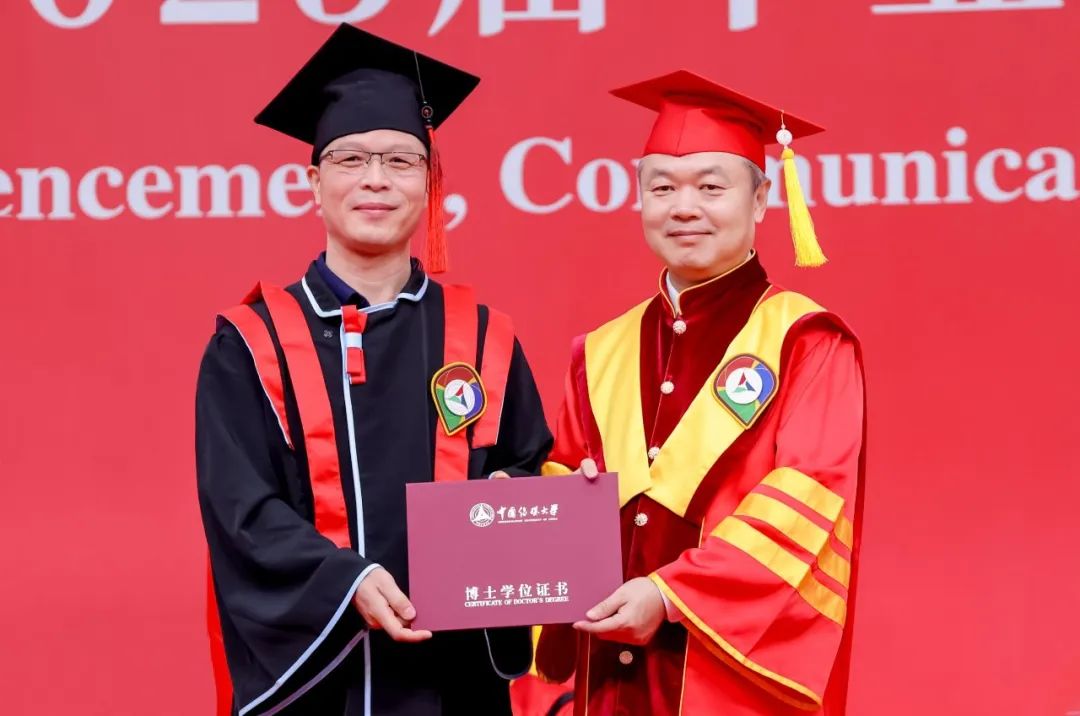 랴오샹중, 장수팅 및 기타 학교 학위평정위원회 위원들이 함께 박사학위, 석사학위, 학사학위를 취득한 졸업생 대표들에게 술수를 옮겨주고 학위증서를 수여했다.