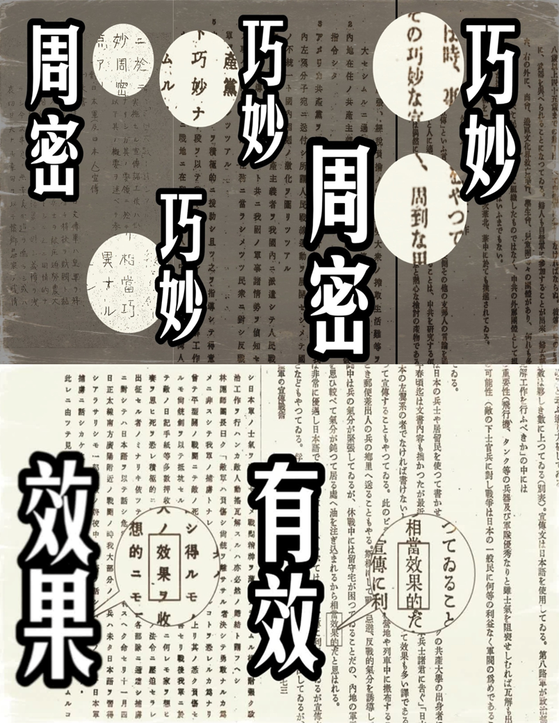 일본 기록물은 중국공산당의 선전 활동을 매우 높게 평가하며 ‘주도면밀, 교묘, 효과적’이라는 단어를 반복적으로 사용했다. 1940년11월 일본 침략군 기록물 ‘석태선 습격 사건 중 팔로군 선전 공작에 대한 관찰’은 팔로군이 실시한 선전 제반 공작이 “상당히 교묘하고 주도면밀하다”고 강조했다. 1939년3월, 일본 내각 정보부 ‘화북 공산군의 선전 전술’은 전투 중 병사들의 긴장된 정서와 사기 저하 상태에서(중국공산당의 선전이) 불에 기름을 붓는 격으로 “상당한 효과가 있다”고 지적했다.