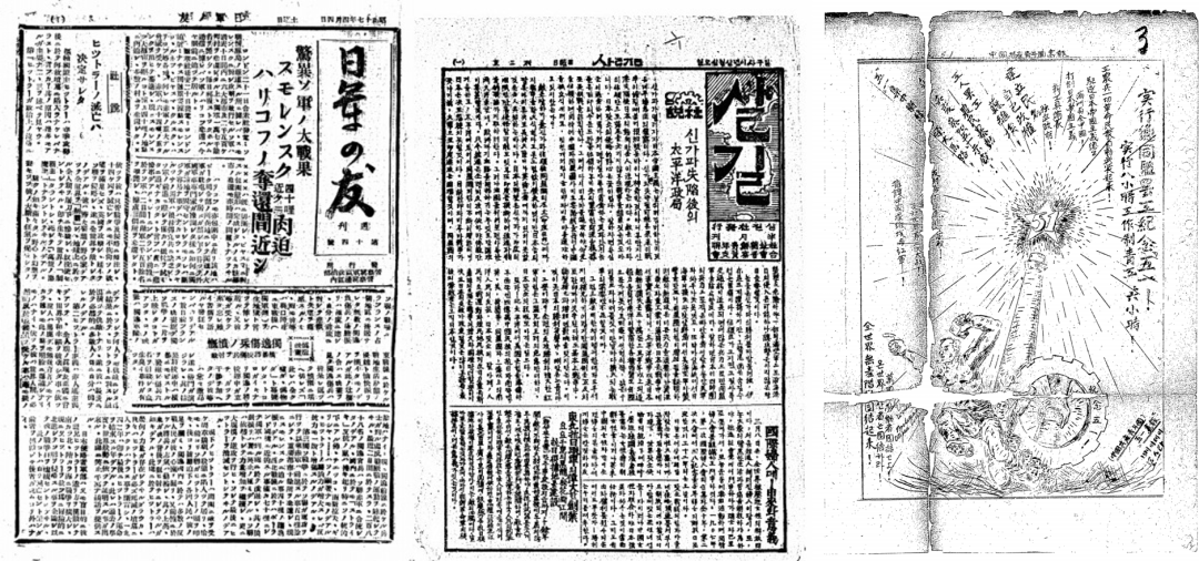 ▲ 항전 시기 중국공산당이 발행한 일문판 ‘일본군의 벗’, 조선어판 ‘활로’ 및 다국어판 ‘중국공산청년단 화보’