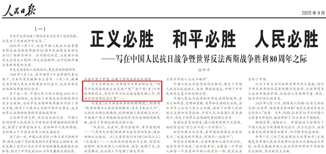 9월2일, ‘인민일보’는 런중핑 칼럼 ‘정의는 반드시 승리하고, 평화는 반드시 승리하며, 인민은 반드시 승리한다- 중국인민 항일전쟁 및 세계 반파시즘 전쟁 승리80주년을 맞아’를 게재했다. 이 칼럼은 두 번째 부분에서 우리 대학의 중대 프로젝트 성과를 인용했다. 일본 측 사료에 따르면, 당시 중국 침략 일본군은 “중국 사상전의 주체는 공산당”이며 “공산당(군)은 교묘하게 민중을 확보하고, 일본군에 대해 끊임없이 사상 와해 공작을 펼쳐 장래에 실로 우려할 만한 일”이라고 분석했다.