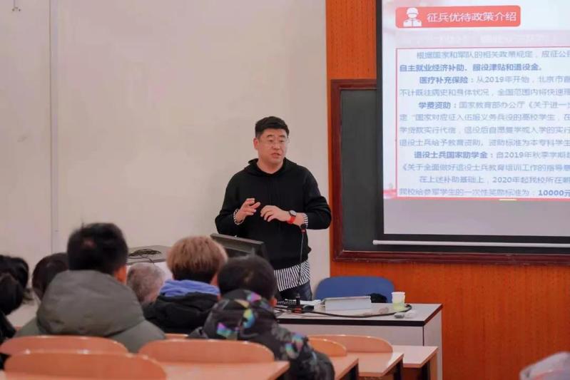 齐金贵部长结合学校实际对国家征兵工作与政策做了进一步讲解,现场为同学们答疑解惑,并请今年退役两名优秀大学生士兵周义献和郭草源(高职学院退役同学)分享经验。